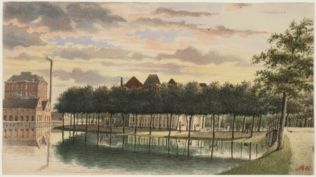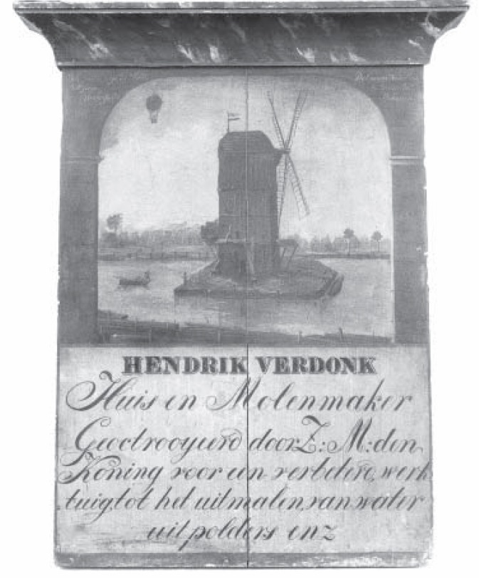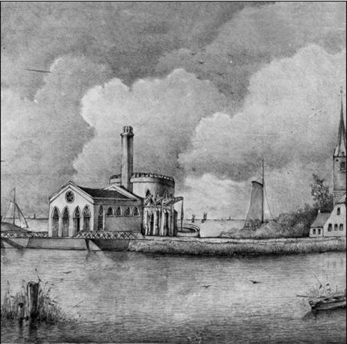 Doelenveld te Alkmaar door B.G.ten Berge - 1870Na veel experimenteren wist hij een model te maken, dat door middel van handkracht het water ruim 60 centimeter opvoerde en een kuip van 45 emmers in een halve minuut opmaalde.