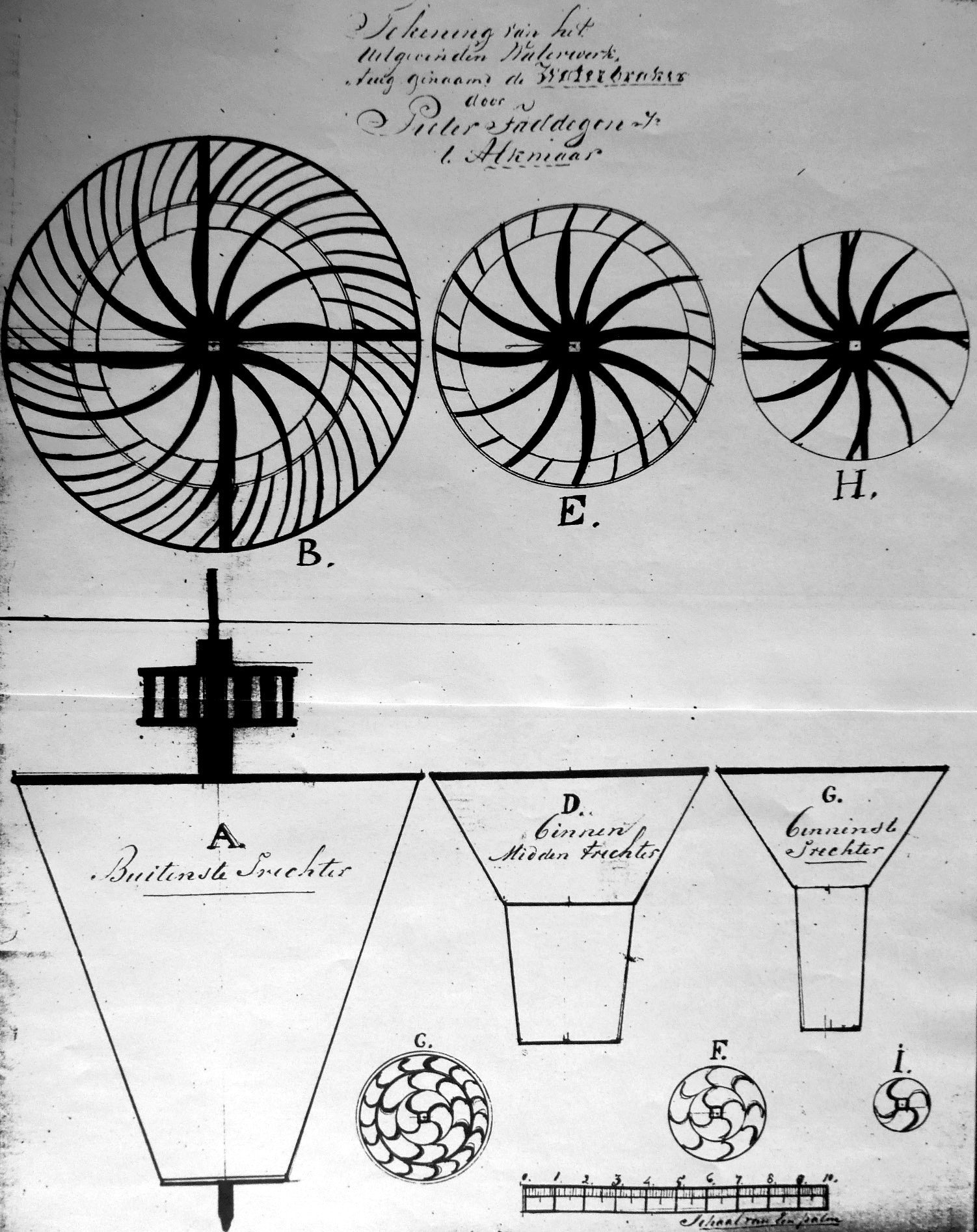 “Beschrijving van een nieuw en verbeterd waterwerktuig genaamd de Perpendiculaire dubbele trechter vijzel of waterbraker geïnventeerd en vervaardigd door Pieter Faddegon Jr. wonende te Alkmaar wijk B No 9.”