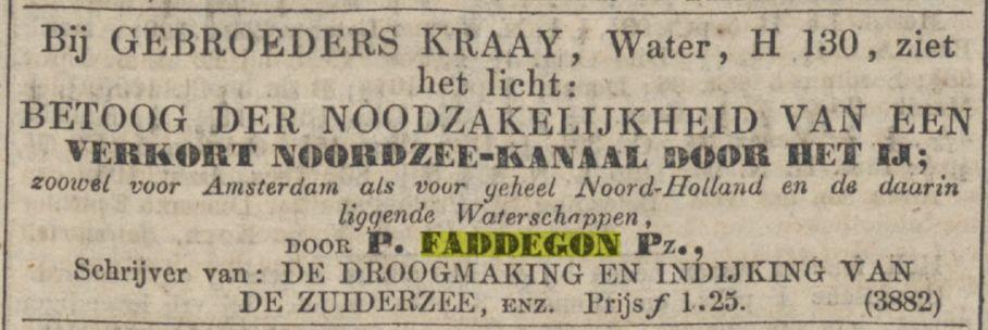 *— Wij ontvingen uit Kaapstad eene brochure van de hh. P. Faddegon senior en junior over de herschepping van Nederland door de droogmaking der Zuiderzee als staatsdomein. De schrijvers stellen de uitvoering als zeer gemakkelijk, de voordeelen als buitengemeen groot voor. Het boekje bevat een kaartje van de doorsnede der Zuiderzee-dijken en een ander van de Zuiderzee na de droogmaking. In een naschrift verdedigen zij dat denkbeeld tegen het vroeger door hen omhelsde plan van aanslibbing en gedeeltelijke droogmakingen. Nu de zaak der Zuiderzee weer aan de orde is, zal men wellicht met genoegen dit boekje lezen, als een bewijs, hoe men zich ook in de Kaapstad voor dit groote denkbeeld warm maakt.